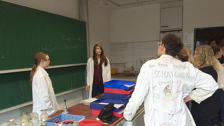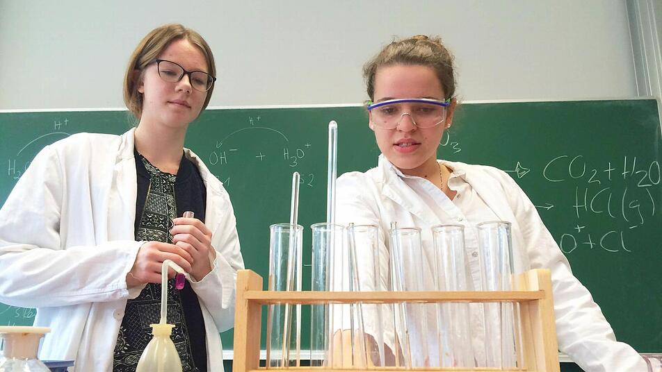Freitag, erste Stunde: Feli und Emma stehen mit Schutzbrille und in weißen Kitteln vor ihren Mitschülern und hantieren mit Reagenzglas und Lackmus. Feli erklärt genau, was da passiert. Christian und Till sitzen derweil unten im Computerraum und besprechen ihr Arbeitsblatt. Auf dem Weg dorthin begegnen wir den Treppenhaushockern: Drei Mädchen sitzen am Boden - mit Blick zur Veste - und fragen sich gegenseitig ab.