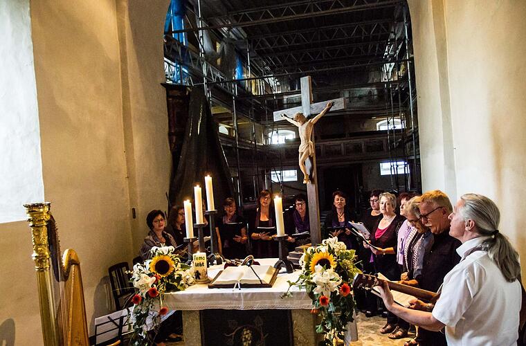 Weitere Gottesdienste im Chorraum sind in den nächsten Monaten geplant (siehe Info-Kasten). Auch sie sollen helfen, das Thema Sanierung verstärkt ins Blickfeld zu rücken und zugleich der Kirchengemeinde den Weg zurück ins angestammte Gotteshaus zu ebnen. Beim ersten musikalischen Abendgottesdienst setzt der Kirchenchor unter Leitung von Gary O'Connell ebenso Akzente wie die junge Harfenistin Cindy Zwosta (13) mit einfühlsamen instrumentalen Klängen.