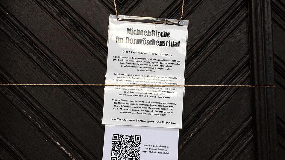 Dieser musikalische Abendgottesdienst wird zum Zeichen der Hoffnung für die Kirchengemeinde Fechheim. "Michaelskirche im Dornröschenschlaf" verkündet ein Zettel am verschlossenen Haupteingang. Seit der Erzengel Michael im September 2013 von der mit Fresken verzierten Decke der historischen Kirche fiel, kann das Gotteshaus nicht mehr genutzt werden - fast vier Jahre schon.