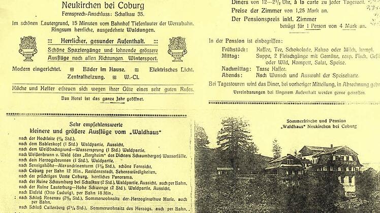 Doch es ist eine Weile her, dass Prospekte für die "Sommerfrische und Pension Waldhaus" warben. Wer damals "im schönen Lautergrund, 15 Minuten vom Bahnhof Tiefenlauter der Werrabahn" Erholung buchte, der konnte für einen Pensionspreis von vier Mark pro Person schon etwas erwarten. "Modern eingerichtet, Bäder im Hause, Elektrisches Licht, Zentralheizung, W.Cl." heißt es in der Reklame. "Küche und Keller erfreuen sich wegen ihrer Güte eines sehr guten Rufes", wird versichert. Eine wichtige Information, gehören doch neben einem Frühstück auch ein Mittagessen mit Suppe, zwei Fleischgängen, Gemüse, Kompott und Salat, Kaffee am Nachmittag und ein Abendessen nach Karte zum Paket für vier Mark dazu.