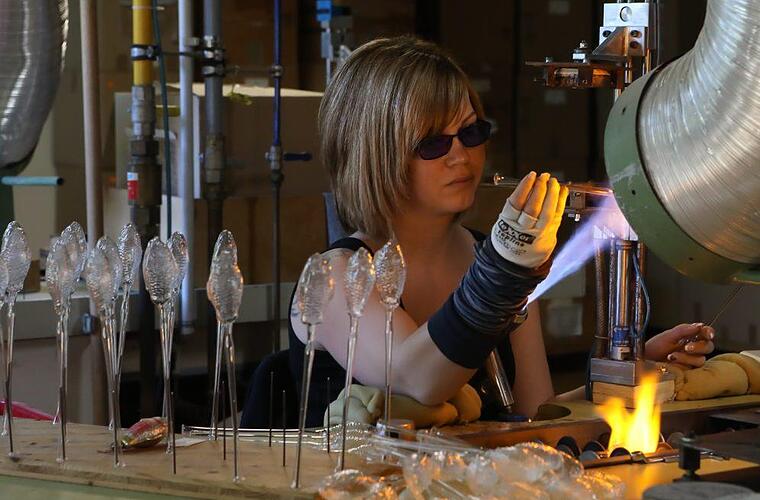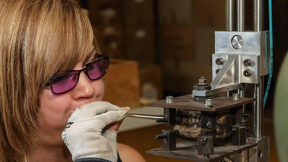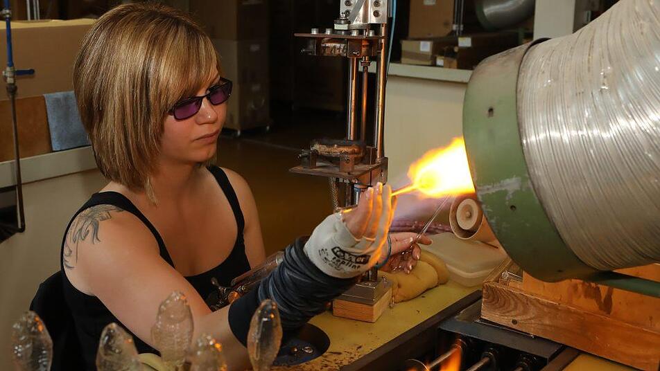 Das Glas bis zum Schmelzpunkt zu erhitzen, es im genau richtigen Moment in die Form zu geben, das erfordert viel Fingerspitzengefühl. Kein Wunder, dass die junge Frau Geduld als wichtige Voraussetzung für jemanden nennt, der in ihren Beruf einsteigen möchte. Kreativität und gutes Vorstellungsvermögen findet sie ebenso wichtig.