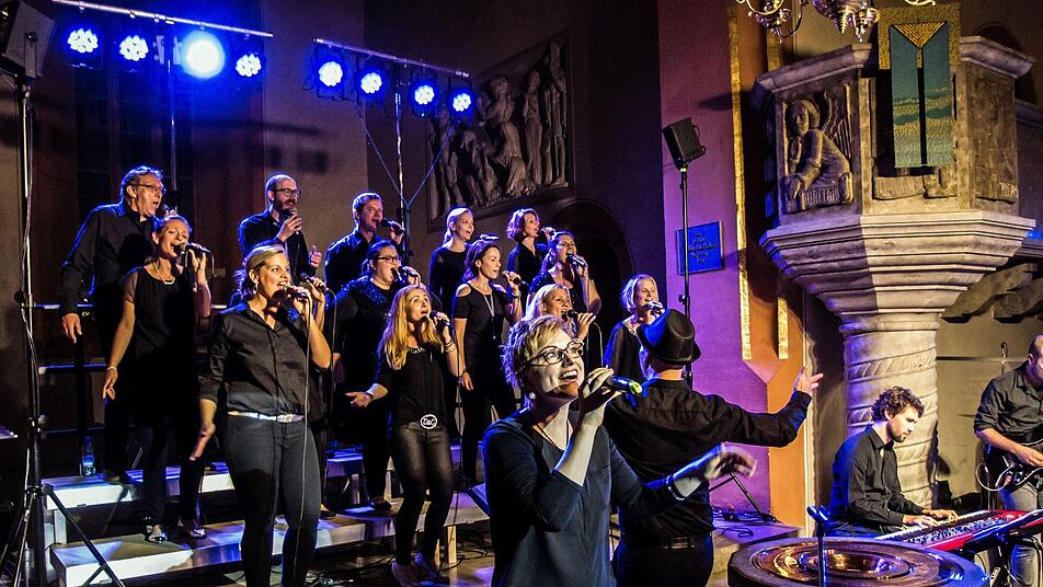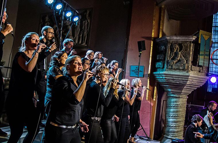 Eine vierköpfige Band liefert versiert und stilsicher den Begleitsound für den 15-stimmigen Chor, der mit Mikrofonunterstützung bis hinauf auf die Emporen bestens zu hören ist.