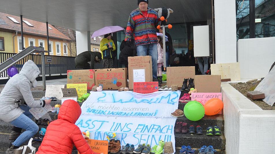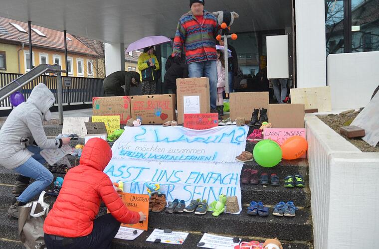 Gut zwei Dutzend Teilnehmer fand ein Aufruf des Vereins "Eltern stehen auf" am Samstag in Neustadt. Kinderschuhe vor Rathäusern sollten deutschlandweit darauf aufmerksam machen, dass Kinder besonders unter den Maßnahmen zur Bekämpfung der Pandemie leiden.