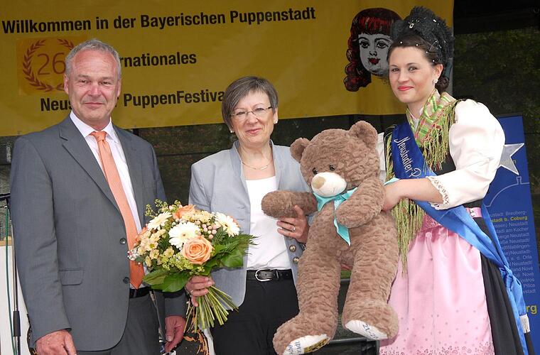 Schirmherrin des 26. Internationalen Puppenfestivals ist Heidrun Piwernetz. Im Gegensatz zu nicht wenigen ihrer Schirmherrn-Vorgängern war die Regierungspräsidentin bei der offiziellen Eröffnungsfeier persönlich zugegen. Sie zeigte sich "überwältigt" von der Fülle der Angebote, die in den kommenden Tagen auf die Freunde von Puppen, Teddys und Spielzeug in den beiden Partnerstädten warten. Piwernetz zeigte sich auch historisch gut informiert und berichtete, dass bereits im 15. Jahrhundert rund um Nürnberg die ersten Spielzeugmanufakturen entstanden, zwei Jahrhunderte später entwickelte sich rund um die Städte Sonneberg und Neustadt ein weiterer Schwerpunkt. Den Herstellern in der Region wünschte die Regierungspräsidentin auch in Zukunft wirtschaftlichen Erfolg - und: "Allen Smartphones zum Trotz noch Kinder, die sich für Puppen und Teddybären interessieren."