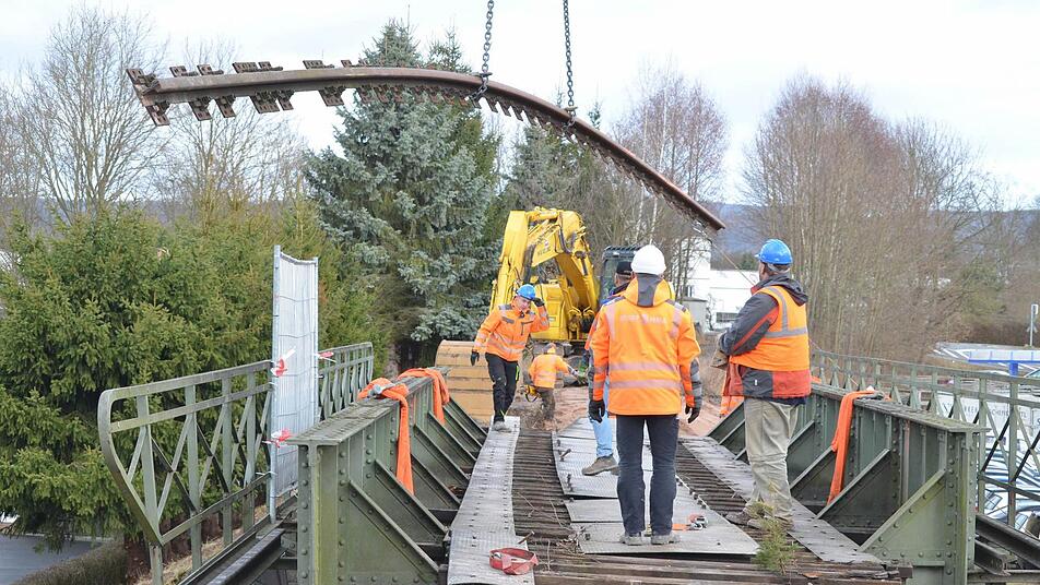 Inzwischen hatten Arbeiter gepolsterte Seilschlaufen an der Brücke angebracht. Doch ehe es an die gesamte Brücke ging wurden die Bahnschienen, die noch auf dem Metallgerüst lagen, abgehoben und auf der Fahrbahn abgelegt. Dann erst ging es an die Brücke selbst.