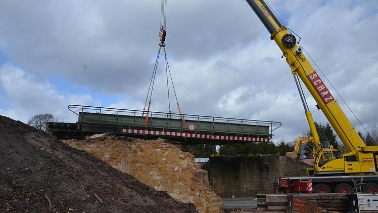 Die Eisenbahnbrücke in der Coburger Straße wurde vom Sockel gehoben und per Schwertransport auf den Parkplatz am Schwimmbad transportiert.