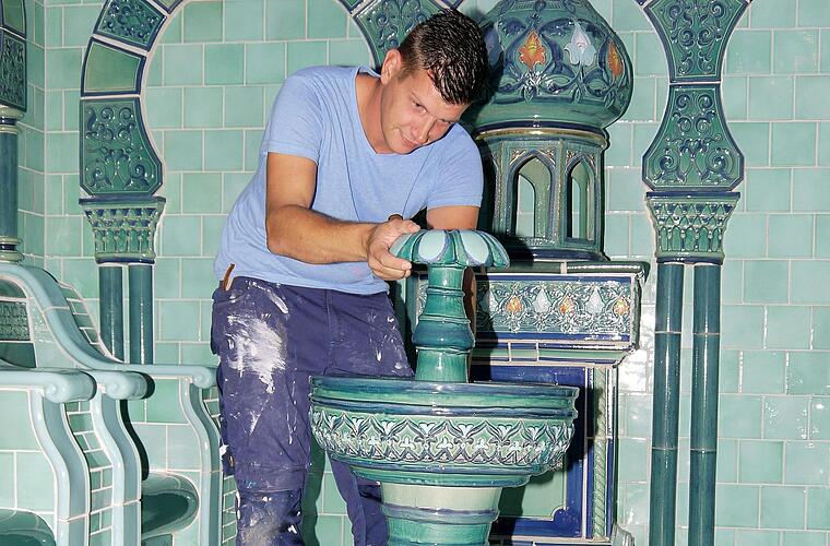 Das war aber eine Punktladung. Auf den letzten Drücker ist am Freitag das letzte Puzzlestück für den perfekten Gesamteindruck zur Wiedereröffnung des "Bademehr"-Familienbades in der Wildenheider Straße gekommen: der Brunnen für das Maurische Dampfbad. "Ich bin dem Hersteller extra noch entgegen gefahren und habe das gute Stück in Bayreuth abgeholt", erzählt Tino Tessmer, der Leiter der Badbetriebe bei den Neustadter Stadtwerken (SWN), während er den in der nähe von München hergestellten Brunnen schön in den Mittelpunkt des blau gekachelten Dampfbades rückt.