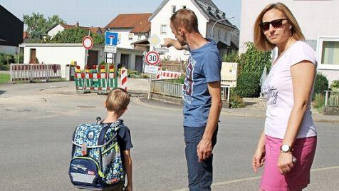 An seinen Schulranzen hat Finn sich schon ein bisschen gewöhnt. Mit wenigen Handgriffen huckelt er ihn auf. Zwei Schnapper und er sitzt fest am Brustkorb. 15 Minuten läuft er bis zum Schulbus - heimwärts dürfte es etwas länger sein. Schließlich geht's nur bergauf. Zusammen mit seinen Eltern ist er den Weg schon abgelaufen: Vorsichtig nähert er sich jeder Kreuzung. In dem Wohngebiet gilt rechts vor links, also zeigt ihn seine Mama genau, worauf er achten muss. Wichtig für Finn: Die Bushaltestelle für den Schulbus wurde verlegt. Da in Sonnefeld Baustelle ist, holt der Bus die Kinder an der Kreuzung vorm Hummenberg ab.
