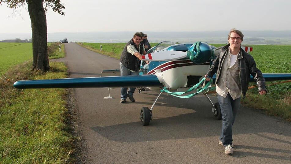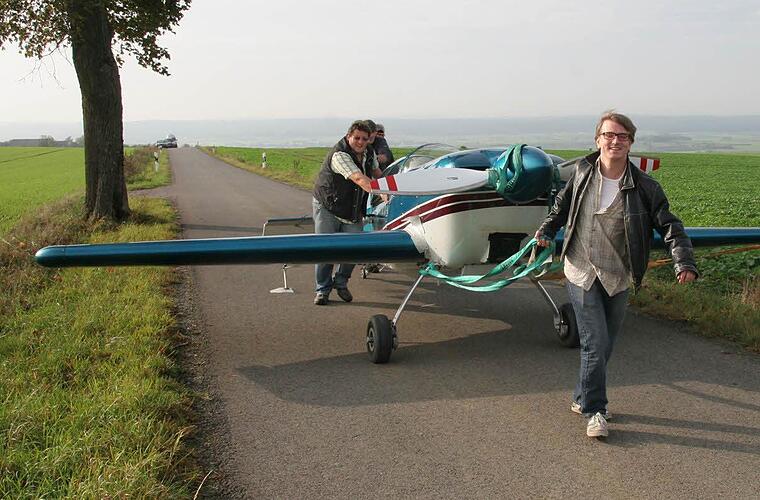 Gemeinsam aus dem Feld gezogen Mit vereinten Kräften - zu denen auch einige Neugierige und Medienvertreter gehörten - wurde das rund 450 Kilogramm schwere Flugzeug aus dem Feld über eine Ortsverbindungsstraße in eine Nebenstraße gezogen. Dort will es der Pilot zerlegen und dann per Anhänger zur Brandensteinsebene als Heimatflugplatz transportieren. Dort wird es dann wieder zusammengebaut. "Das ist kein großes Problem. Bald steht die Maschine wieder da, wo sie hin gehört ", betonte der 54-Jährige.