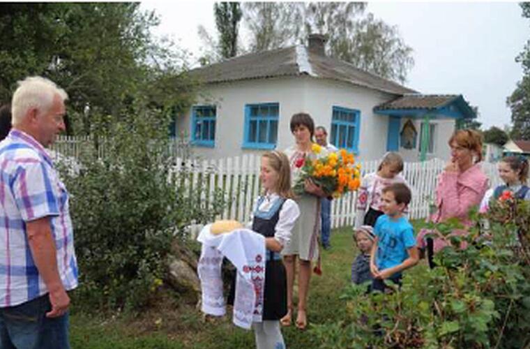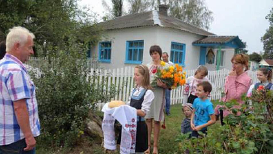 "Mitten in der Nacht kommen wir am Zielort an und werden von vielen Freunden und Bekannten begrüßt. Auch Vika ist da, eines unserer Gastkinder von diesem Sommer. Sie ist extra mit Ihren Eltern ins Dorf gekommen und hat auf uns gewartet. Wir werden von ihr nach ukrainischer Tradition mit selbst gebackenem Brot willkommen geheißen", notiert Bettina Schwirz in ihr Reisetagebuch.