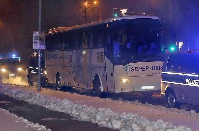 Mit diesen Worten erklärte ein Polizeisprecher in Dessau am Sonntagabend die Maßnahme, den Handball-Bus aus Coburg mit Polizei-Eskorte durch die Stadt bis auf die Autobahn zu begleiten. Mannschaft, Fans und Betreuer wurden nach dem Schlusspfiff beschützt, um möglichen Ausschreitungen vorzubeugen. Hintergrund waren die in jüngster Vergangenheit rivalisierenden Fangruppen beider Lager. Die aufwendige Maßnahme - im Einsatz waren zwei Hundertschaften und Hundestaffeln - zahlte sich aus, denn außer ein paar Schlachtrufen, mit denen sich beide Seiten gegenseitig beschimpften, blieb die Lage ruhig. Zu den erwarteten und im Vorfeld befürchteten Handgreiflichkeiten kam es deshalb nicht. Die sogenannten Problem-Fans erhielten außerdem gar keinen Zutritt zur Halle. - Im Bild der HSC-Mannschaftsbus in mitten mehrerer Polizeibusse.