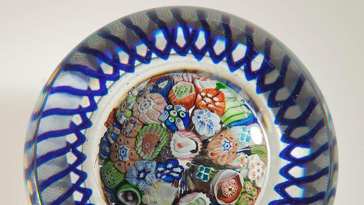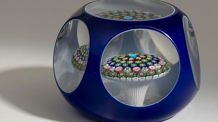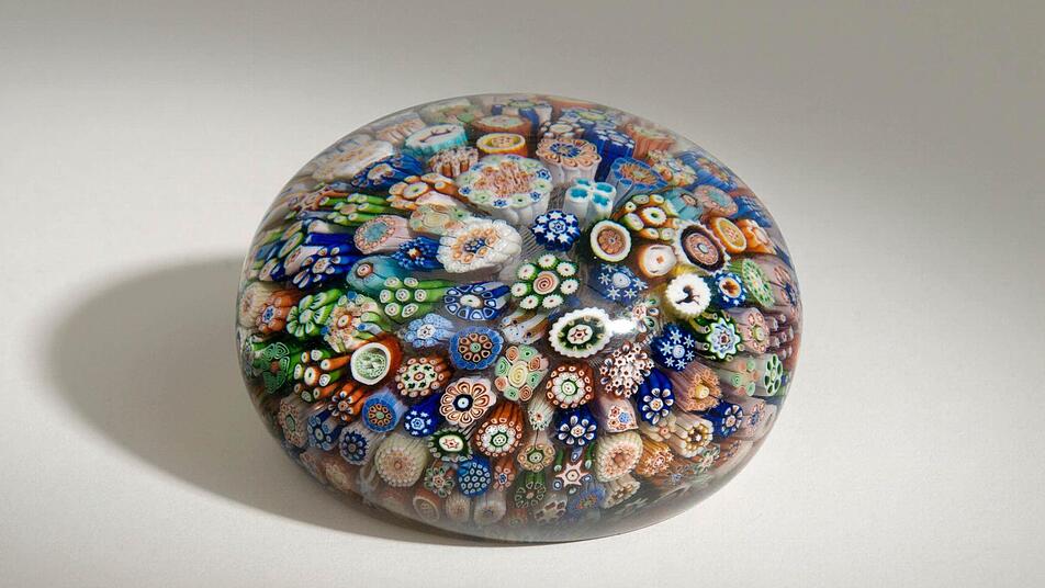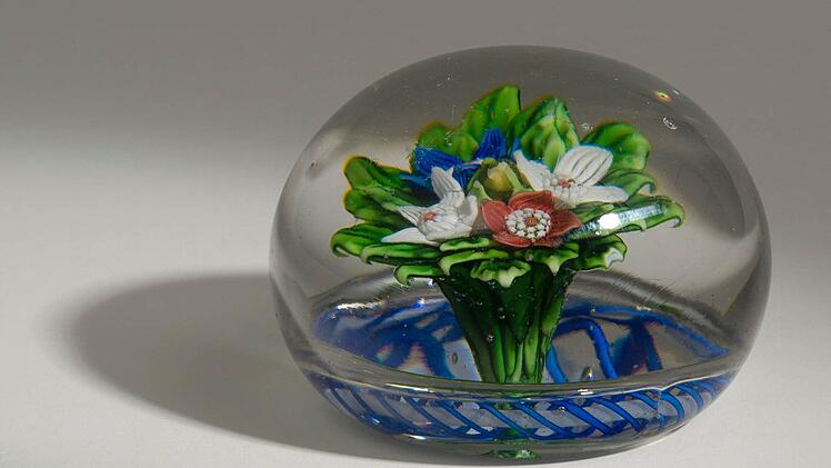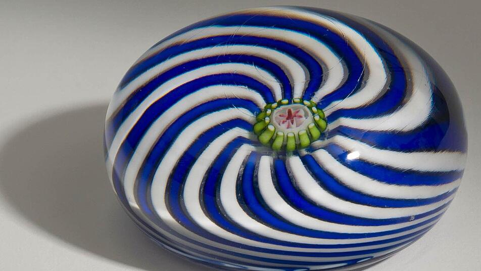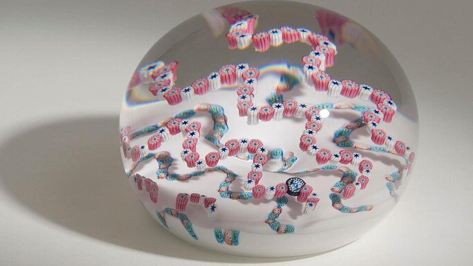 Das Resultat sind - bei den Millefiori-Kugeln wie bei den Paperweights - bunte, filigrane Muster. Rund 500 Paperweights hat der in inzwischen hochbetagt in Kassel lebende Sammler Karl-Hans Knudsen in mehreren Jahrzehnten zusammengetragen. Neun davon hat Hauschke in die Dauerausstellung integriert.