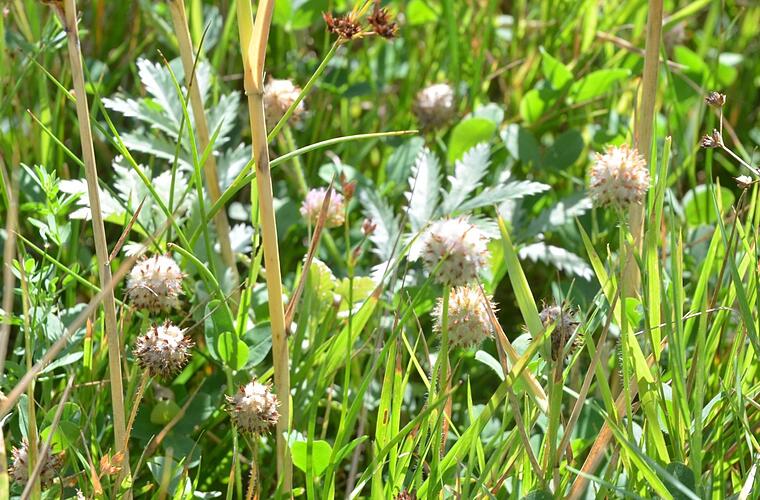 Es lohnte sich also ein genauer Blick auf die Flora des Überleiters, in dem durch das Abtragen der oberen Bodenschichten ein Pionierstandort entstanden ist. Dabei fand sich eine weitere Salz tolerierende Pflanze: Erdbeerklee, der mit seinen kugeligen Blütenständen recht auffällig zwischen den Schilfstängeln steht.
