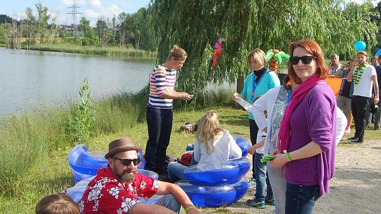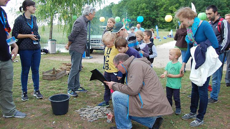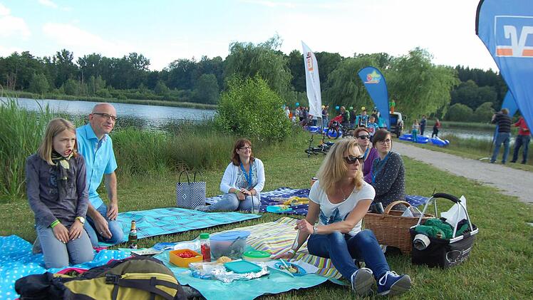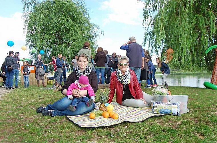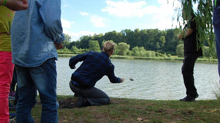 Ihre neue Picknickdecke probieren dagegen Annemarie Heinlein aus Neustadt und Katrin Kühnel aus Coburg gleich aus. Beide haben einen von fünf Picknickkörben gewonnen, die die Veranstalter verlost hatten. Während Leon an der Wifi-Anlage das Steineflitschen übt, sammeln sich vorn am Ufer die, die es wirklich wissen wollten. Anfangs scheint es gar nicht so einfach. Es wollen nicht mehr als ein, zwei Steinehüpfer auf dem bewegten Wasser gelingen. Doch dann geht's Stein auf Stein: Silke Hartung legt vier vor. Kurz darauf überrascht Pascal Sommerluksch mit fünf. Wirklich geübt hatte im Vorfeld keiner. Jeder versucht es mit seiner eigenen Technik - ob in der Hocke oder aus dem Stand. Am Ende siegt Margit Kasza (15 Jahre) mit acht Flitschern! Das Mädchen aus Budapest liegt knapp vor den beiden Zweitplatzierten, die ihre Steine jeweils sieben Mal übers Wasser springen lassen: Matteo Stefani, 8 Jahre, aus Coburg und Georg Böhnlein (Untersiemau).