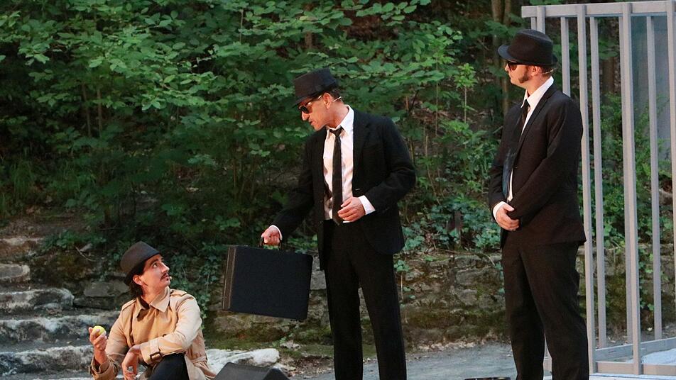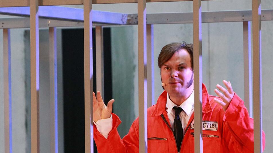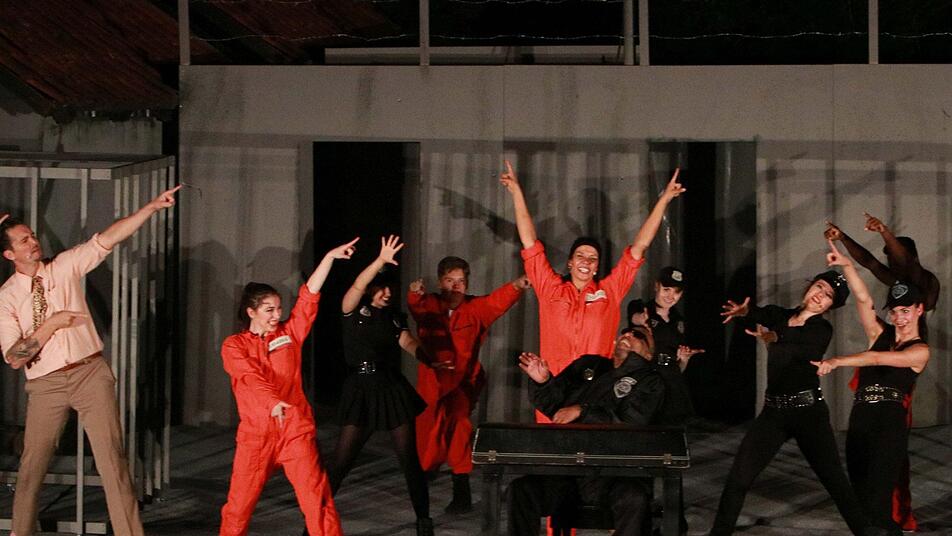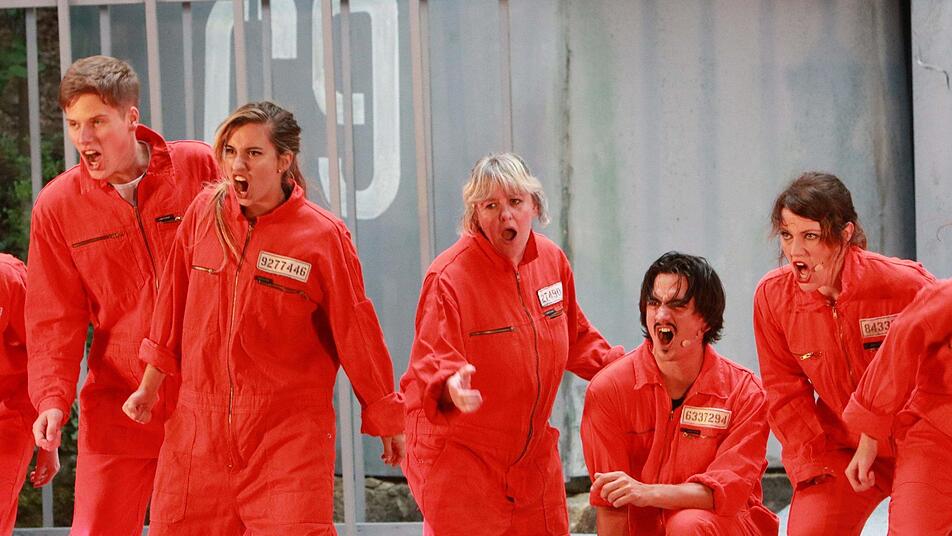 Die Verwandlung der Waldbühne Heldritt gelingt mit verblüffend einfachen Mitteln. Für die Coburger Sommeroperette wird aus dem Freilicht-Theater im Grünen ein graues Gefängnis mit Häftlingen in orangefarbenen Sträflingsanzügen. Im Hintergrund eine Wand in Beton-Optik mit Stacheldraht-Krone, zwei fahrbare Käfig-Konstruktionen auf der Bühne, dazu die siebenköpfige Band im Orchesterpavillon mit Gitter-Anmutung - mehr ist nicht nötig, um "Blues Brothers"-Atmosphäre nach Heldritt zu bringen.