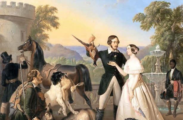 Einmalige Chance 1844 hatte Coburgs Herzog Ernst II. den Künstler in die Vestestadt eingeladen. Bis 1845 blieb Raden Saleh als Gast des Herzogs, schuf Jagdbilder und Porträts in Öl wie jenes Doppelbildnis, das den Herzog und seine Gemahlin Alexandrine nach der Jagd zeigt. Vor der Kulisse von Schloss Rosenau mit seinem malerischen Türmchen und dem munter plätschernden Brunnen zeigt der Herzog als stolzer Jäger seiner Frau die stattliche Jagdbeute.