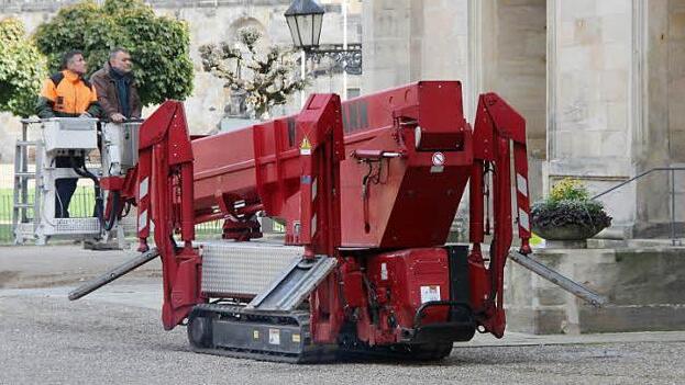 Ein Hubsteiger für Franken Die Ostseite des Innenhofs sehe etwas besser aus als die Westseite, erläutert er. Denn auf der Westseite ist es schattiger, da trocknet der Stein schlechter ab und verwittert schneller. Doch ganz wird Schweizer zunächst nicht ums Schloss herum kommen: Der Hubsteiger steht nur noch am heutigen Donnerstagvormittag zur Verfügung. Die Maschine ist in Bayreuth stationiert und wurde eigentlich angeschafft, um Bäume auszusägen erzählt Holl. Davon zeugt auch die machetenförmige Säge im Steigekorb. "Wir haben aber auch schon Dächer gedeckt, und für die Fassadenbegutachtung sind wir in ganz Nordbayern unterwegs."