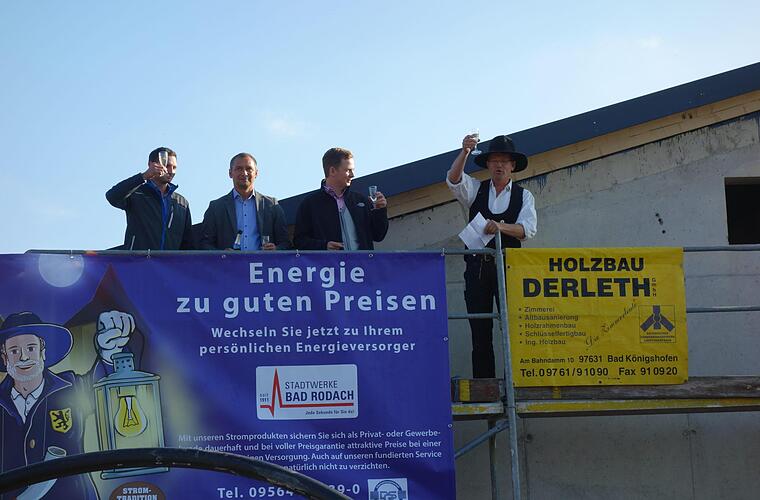 "Wir sind im Kostenrahmen geblieben", erklärte stolz Bürgermeister Tobias Ehrlicher (SPD) auf dem Baugerüst, auf dem auch in Zimmermannskleidung Anton Schneider den Richtspruch von sich gab, begleitet vom Netz- und Wassermeister Christian Mielsch und vom stellvertretenden Werkleiter Clemens Koropecki.