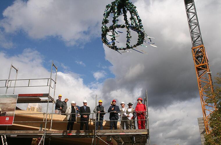 In Ahorn derzeit mit Hochdruck an zwei großen Bauprojekten gearbeitet wird. Beim Lehrschwimmbecken konnte Richtfest gefeiert werden.