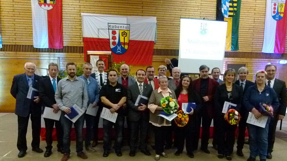 Aufgrund eines Stadtratsbeschlusses konnte Marco Steiner vier Bürgern, die sich durch ihr Wirken oder ihre Leistung um das Wohl der Stadt und ihrer Bürger verdient gemacht haben, den Ehrenteller überreichen. Udo Hoppe wurde als ehemaliger BRK-Kreisbereitschaftsleiter ausgezeichnet. Hoppe wurde als einer der prägenden Köpfe in der Region mit mehr als 45-jähriger ehrenamtlicher Tätigkeit, die beeindruckend sei, bezeichnet. Ingrid Ott hat sich langjährig engagiert in der Politik, insbesondere als CSU-Stadträtin, in der Wirtschaft, der Kultur und im sozialen Bereich, wobei sie als absolut ehrlich und zuverlässig bezeichnet wurde. Sie sei Ansporn und Vorbild, hieß es weiter. Jörg Wagner, Inhaber des Edeka-Marktes, der mit seinem Geschäft die Nahversorgung sichert, sich regional verbunden zeigt und ein offenes Herz für die Belange der Vereine und Organisationen hat, erhielt ebenfalls den Ehrenteller. So auch Christel Zschach, die sich seit über 50 Jahren ehrenamtlich in Rödental engagiert, ein breites Spektrum abdeckt und dort überall bereitwillig hilft, wo sie gebraucht wird.