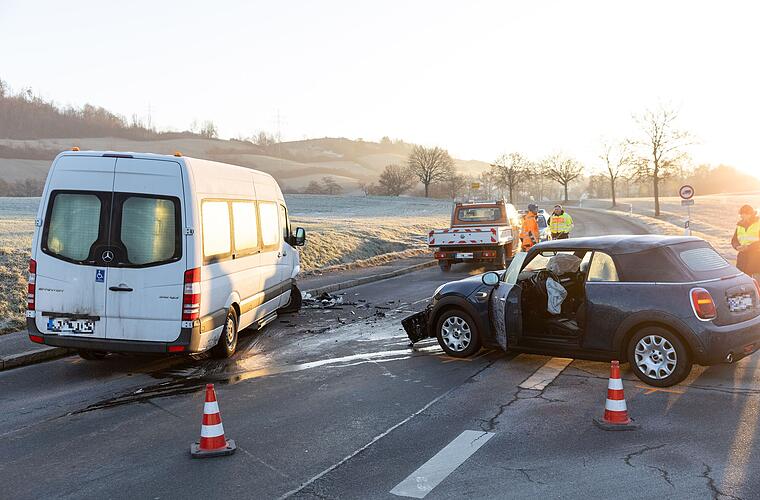 Daraufhin kollidierten die Fahrzeuge nahezu frontal miteinander, wie die Polizeiinspektion Neustadt bei Coburg meldet. Der 61 Jahre alte Fahrer des Transporters sowie dessen 73-jähriger Beifahrer zogen sich leichte Verletzungen in Form von Prellungen zu. Der weitere Fahrgast und auch der 57 Jahre alte Mini-Fahrer bleiben unverletzt.