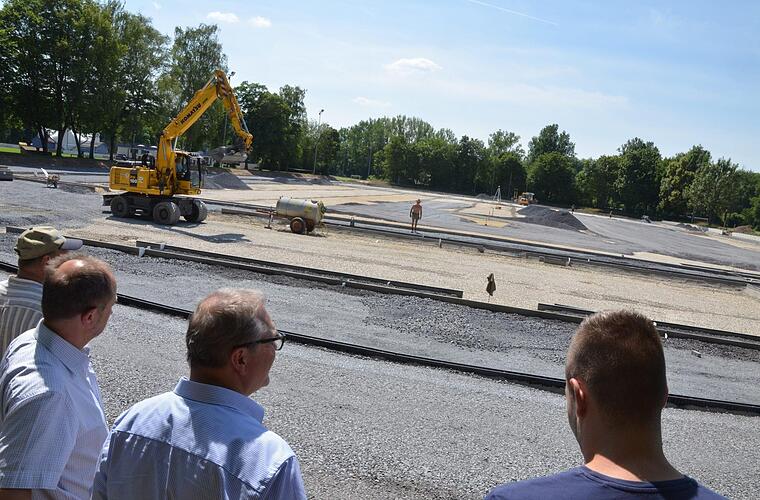 Viele Jahre lang war die Schulsportanlage der Stadt ein Sorgenkind. Jetzt wird sie aufpoliert. Zurzeit wird mit viel Aufwand ein Kunstrasenplatz angelegt, den sich die Mitglieder des Bausenats bei einem Ortstermin anschauten. Von Rasen ist allerdings noch nichts zu sehen.