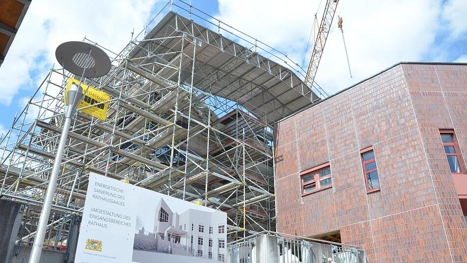 Aus dem Fenster seines Büros hat Rödentals Bürgermeister Marco Steiner (FW) eine der wichtigen Baustellen der Stadt direkt im Blick. "Wir sind gut im Zeitplan" sagt er. Der Umbau des Rathaussaals und des gesamten Eingangsbereichs läuft so wie er laufen soll.