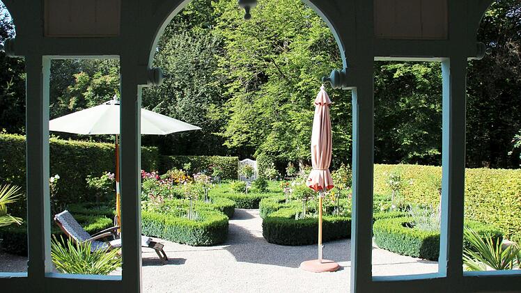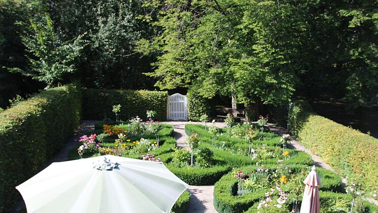 Auf den ersten Blick wirken die von Buchs gefassten Beete unförmig rund. "Wie lauter kleine Nierentische", dachte Carola Rückert und wunderte sich. Doch der Blick vom Dichterstübchen Friedrich Rückerts herab auf den kleinen Garten in Neuses offenbart die durchdachte Schönheit des Rosengärtchens. Die Beete bilden ein großes Blatt, aus dessen Mitte Rosenbäumchen sprießen. "Nur in rot, rosa und weiß", wie die Rückertexpertin verrät. Und das hat seinen Grund.