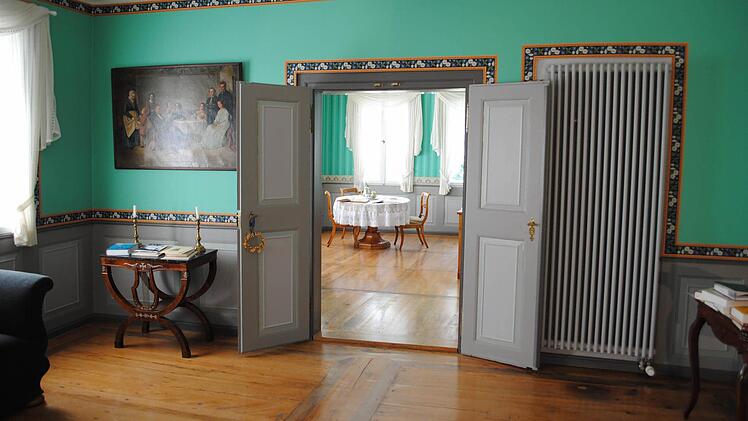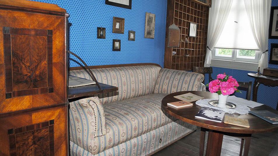 In zwei weiteren Räumen des ersten Stockes stehen Leihgaben aus Schweinfurt, Möbel aus Familienzusammenhang. Die Tapeten sind den originalen nachempfunden, aber bittschön ohne das damals verwendete Arsen, das die Leuchtkraft für das "Giftgrün" hervorbrachte und gleichzeitig Mücken fern hielt.