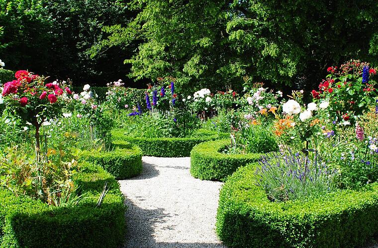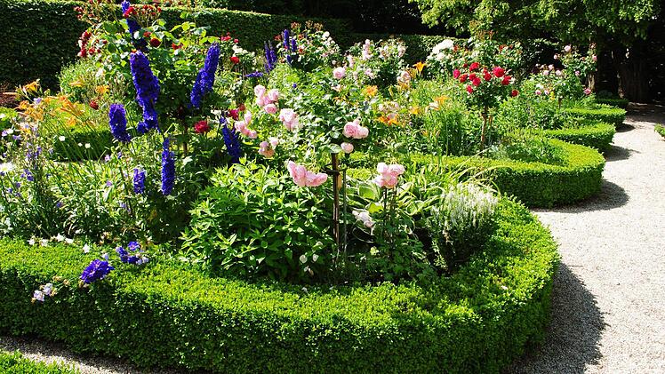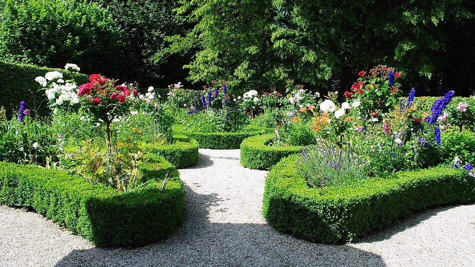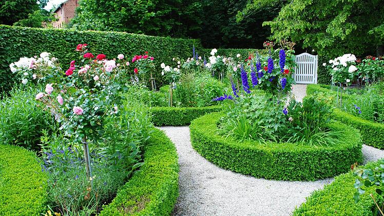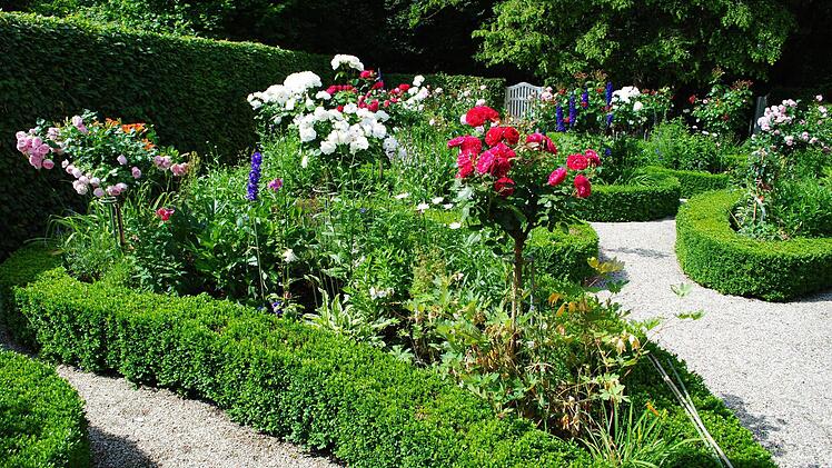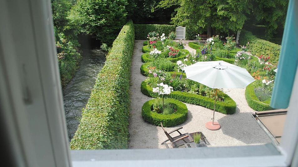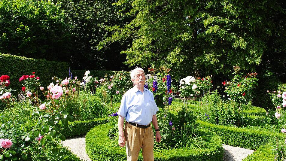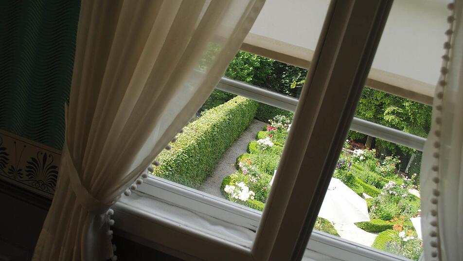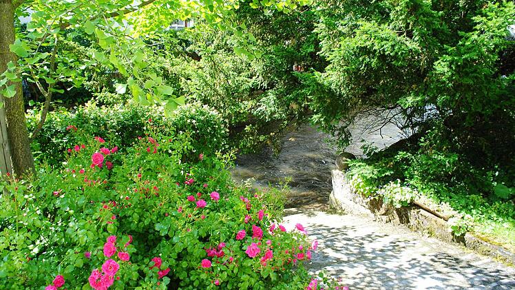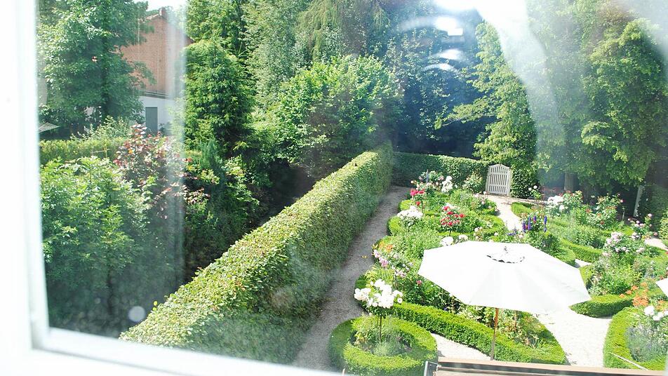 Derzeit freut sich Klaus Rückert vor allem über den üppig blühenden, rekonstruierten Biedermeier-Rosengarten hinter dem Haus. Im Katasteramt fand man Unterlagen, wie Friedrich Rückert ihn angelegt hatte. Links rauscht die rasche Lauter vorbei. Westlich hinter der schützenden, mächtigen Linie aus alten Bäumen liegt der von der Straße aus zugängliche Rückert-Park mit seinem imposant hohen Denkmal für den imposant zwei Meter großen Dichterriesen.