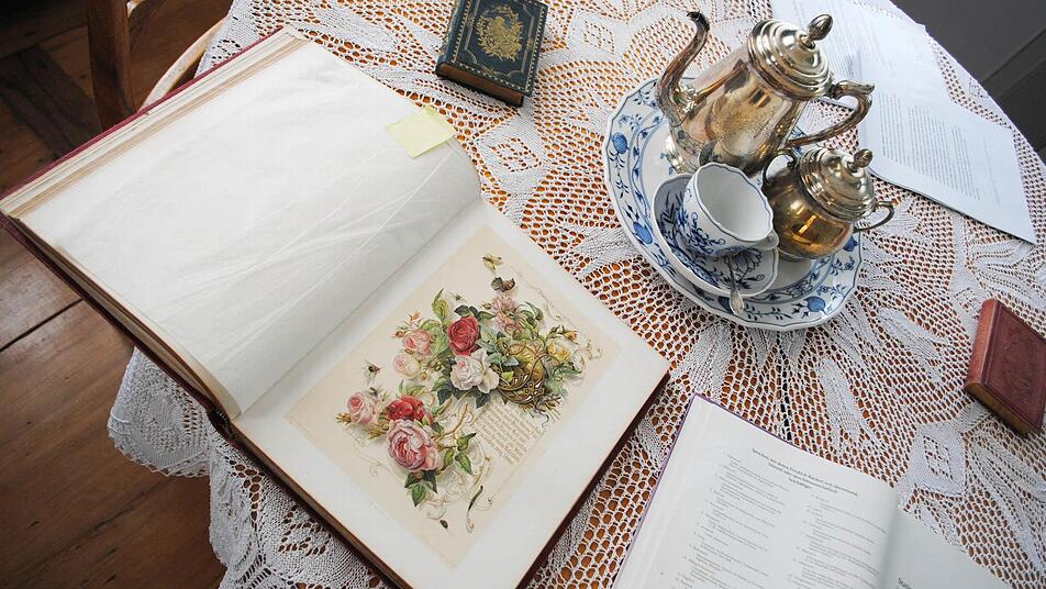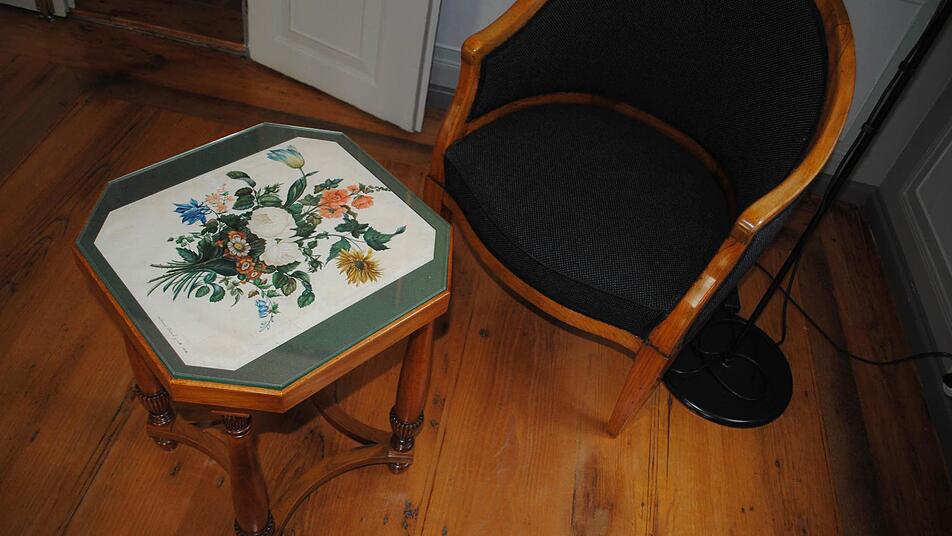 Und die "aktuellen", in Coburg verbliebenen Rückerts sind auch noch Hüter vieler Detailgeschichten, erzählen etwa, dass Bayernkönig Ludwig I. Rückert dieses kunstvolle Tischchen verehrte, als Trost dafür, dass es mit der Münchner Professur nichts wurde. Gemälde im ganzen Haus vergegenwärtigen die Generationen nach Rückert, der mit seiner tüchtigen Luise (1797 - 1857) zehn Kinder hatte. Das Gut in Neuses erwarb er 1838. Rückerts überlebende Kinder gingen in alle Welt.