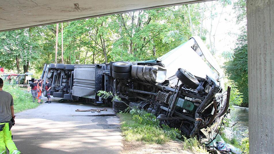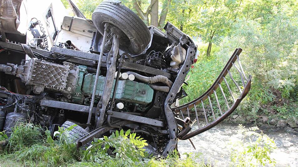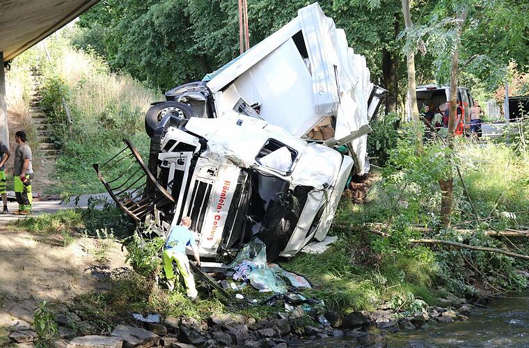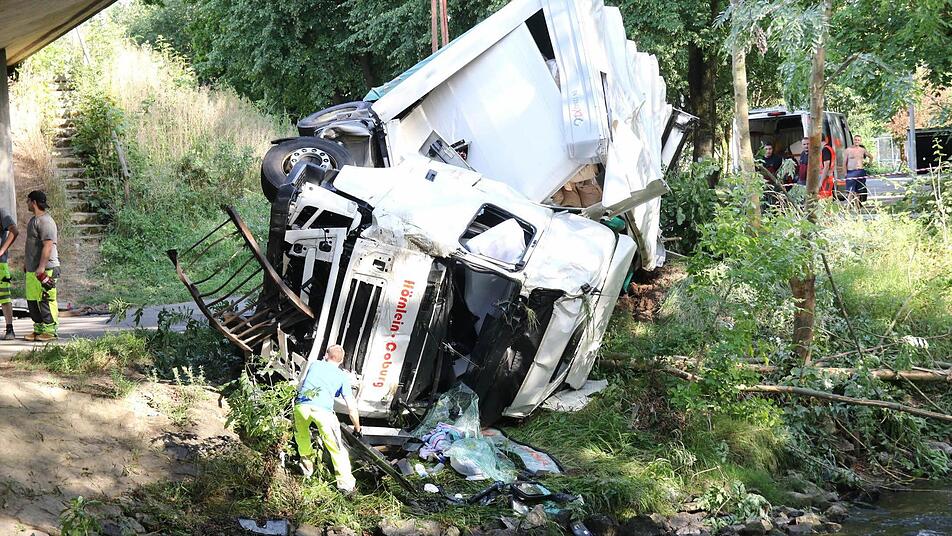 Es muss rasend schnell gegangen sein: Ein 40-Tonner-Sattelzug war am Freitagnachmittag auf der vierstreifigen B4 in Richtung Coburg unterwegs. Dort, wo die Straße in zwei Fahrstreifen übergeht und eine Brücke über die Itz führt, geriet der Laster auf die Gegenfahrbahn, touchierte einen entgegenkommenden Audi A3 an der Fahrerseite und krachte schließlich durchs Brückengeländer. Unten faltete sich der Lastzug wie ein Spielzeugauto zusammen - ganz unten, halb am Ufer, halb in der Itz, lag das Führerhaus, darüber der Auflieger mit dem Tank und obendrauf der Auflieger mit einigen beladenen Paletten und Säcken.