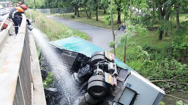Das Augenmerk der Feuerwehr galt erst dem Wrack und dann der Itz: Diesel rann aus dem aufgerissenen Tank des Lastzuges. Die Feuerwehren aus Stadt und Landkreis errichteten mehrere Ölsperren itzabwärts. Dann hieß es warten, bis die Bergungskräne anrückten. Auch das Technische Hilfswerk war gefragt, denn zunächst musste der Behälter mit dem Zusatzstoff für den Diesel vom Lasterwrack entfernt und entleert werden. Das THW stellte ein Gerüst in die Itz, um eine Arbeitsfläche zu haben. Trotzdem riss beim Ausbau des Behälters ein Stutzen ab. Zwei THW-Männer bekamen die Harnsäure ab, mussten mit Wasser abgespritzt und notärztlich versorgt werden.