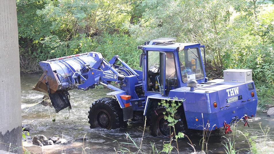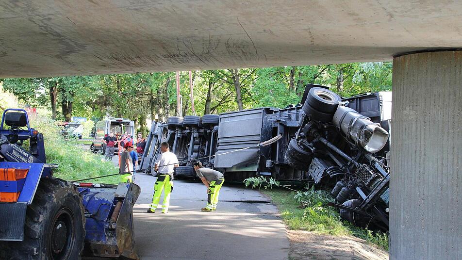 Unten in der Itz sicherte Radlader "Jacqueline" das Führerhaus des Wracks, von oben und von der Zufahrt zur Kläranlage her zogen die Kräne des Bergungsunternehmens, bis das Führerhaus aus dem Wasser gehievt war. Dann musste erst noch das Brückengeländer abgeflext werden, das sich ins Führerhaus verkeilt hatte. Die Arbeiten waren bei Redaktionsschluss noch nicht abgeschlossen. Danach sollte der Sattelzug geteilt werden; der Auflieger wurde abgeschleppt. Vorher mussten noch zwei Reifen gewechselt werden.