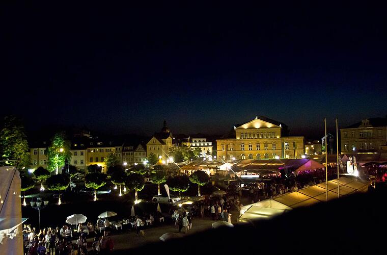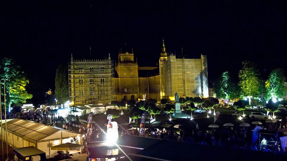 Bestes Wetter, beste Stimmung: so feiert Coburg sein Jubiläums-Schlossplatzfest. Bis weit in die Nacht hinein genießt das Publikum das Ambiente, das kulinarische Angebot und die Darbietungen auf der Showbühne.