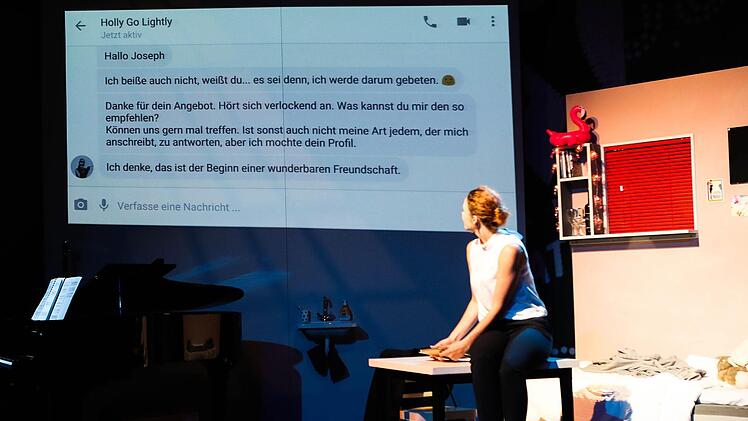 "Heirate mich ein bisschen" war eine Art Revue aus Sondheim-Songs, unveröffentlichte oder aus seinen großen Musicals entnommen, die schon 1980 off-Broadway auf die Bühne kam. Diese gut einstündige Liederfolge um zwei einsame junge Menschen in New York, die nicht zueinander finden, wurde schon vielfach unter verschiedenen Prämissen interpretiert. Sie lässt sich, wie Regisseurin Amelie Elisabeth Scheer in der Reithalle beweist, sehr treffend und berührend in die im Virtuellen entschwindenden heutigen Verhältnisse übertragen.