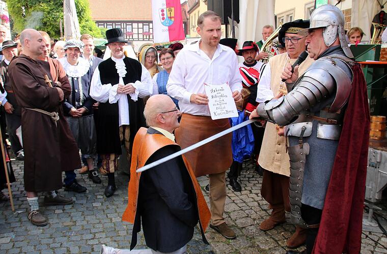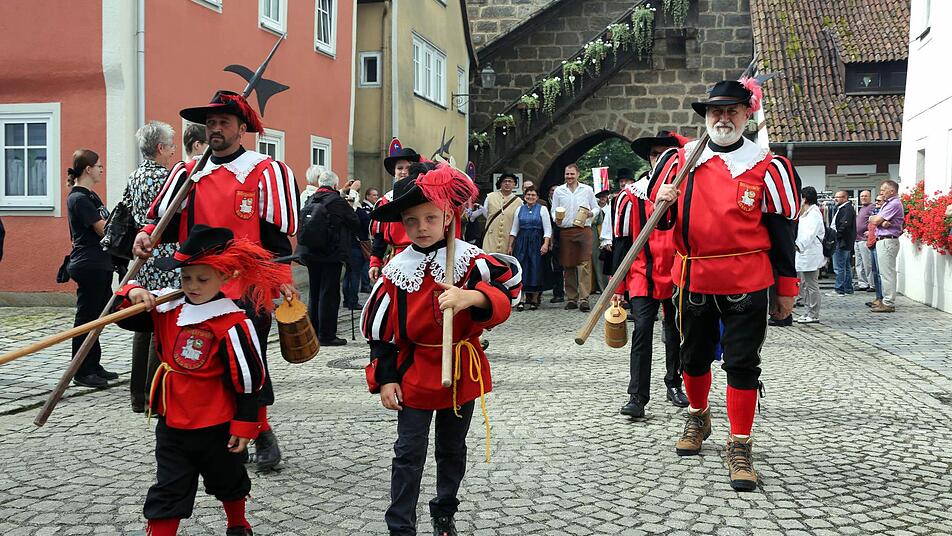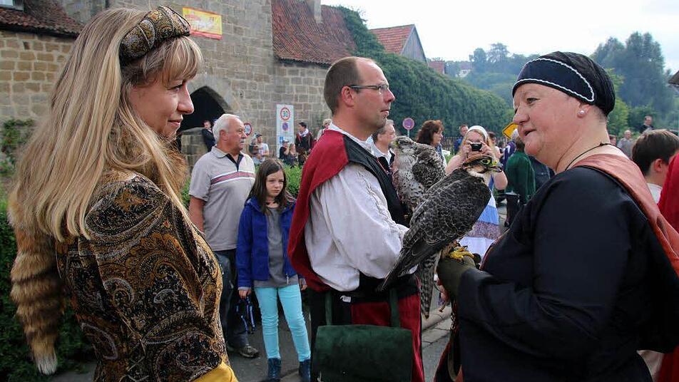 Flankiert von der Bürgerwehr, dem Seßlacher und Schwebheimer Ritter, flanierten beim Umzug Landsknechte zu Merchingen, Musketiere aus Höchstadt/Aisch, Mönche vom Georgenberg, Kaufleute aus Bad Staffelstein, Erlebnisfalkner aus Tambach, der Rödentaler Heimatverein, Ritter zum Heiligen Kreuz zu Coburg und viele andere vorbei.
