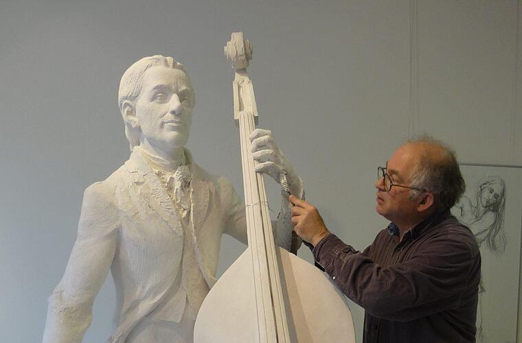 Wie der in Seßlach lebende Bildhauer den Kontrabassisten Johannes Matthias Sperger mit einem Denkmal würdigt.