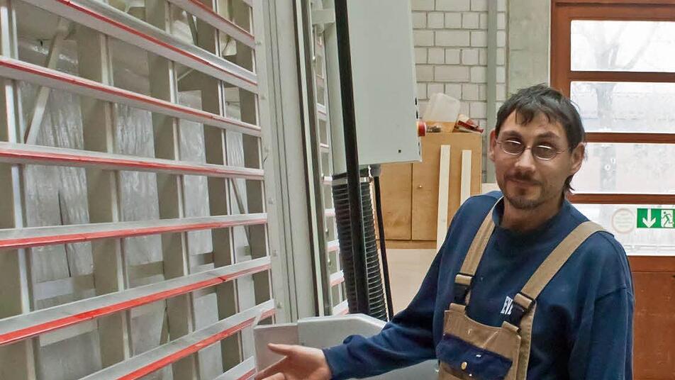 Denn die müssen schließlich auch im Theater den Aufbau und die Umbauten bewerkstelligen. Der Montagesaal - nackte, unverputzte Wände, Betonstreben als Gerüst, Licht, das von oben hereinfällt - ist deshalb von den Maßen her im Grunde eine Kopie der Bühne im Landestheater bis hin zur Bühnenschräge und der Markierung für die Drehbühne.