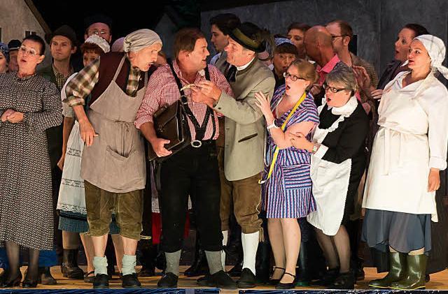 Wenn sich morgen Abend die vielen Mitwirkenden im Schlussbild zum versöhnlichen Glaserl Wein zum letzten Mal in dieser Inszenierung zusammenfinden, dann hofft Adelheid Frankenberger, Vereinsvorsitzende, Geschäftsführerin, Projektleiterin, die 8000er Besuchermarke auf der Waldbühne wieder erreicht zu haben. Doch wurde in der ersten Spielwoche die Kasse durch Kälte und Nässe arg verregnet. Immerhin gibt es heute noch zweimal (14 und 19.30 Uhr) und morgen um 18 Uhr die Gelegenheit zum Ausflug in das stimmungsvolle Waldbühnen-Ambiente, zu Bratwurst und Bier und Wein und was sonst noch zum entspannten Sommerfestival-Besuch dazu gehört. Und vor allem zum "Fidelen Bauern".