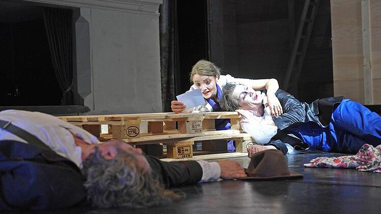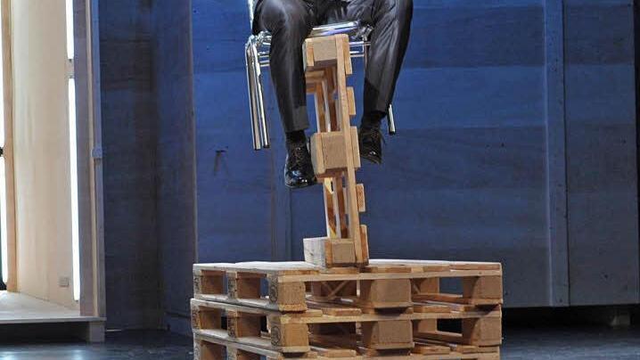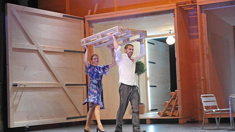 Die zweite Hälfte des Stückes, in der Georg eine fulminante Wirtschaftskarriere hinlegen darf, wirkt zwar differenzierter und authentischer, auch dank Kerstin Hänel als von Ernas Notlüge ebenfalls tief getroffener Hoftochter Gerlinde. Sie muss he roisch aber überflüssiger Weise auf ihren Geliebten Georg verzichten, der vermeintlich ihr Bruder ist, dann aber eben doch nicht. Doch Stück und Inszenierung stürzen und stolpern eher nervig immer weiter über die Holzpaletten. - Mensch, was muss der Leberle in dieser Produktion doch herum schuften.