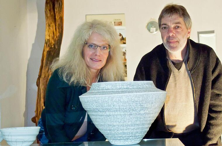 Dazu zählen sogenannte Bogenvasen, die mit ihrer markanten Form und ihrer Oberflächengestaltung fast schon zum Markenzeichen geworden sind. Bei den gemeinsamen Arbeiten übernimmt in der Regel Sigrun Wassermann die Formgebung, während Klaus Dorrmann für die Glasur und das Brennen zuständig ist. "Manchmal habe ich dabei richtig Stress, wenn es darum geht, eine besonders gelungene Form glasurtechnisch nicht zu verderben", sagt Dorrmann.
