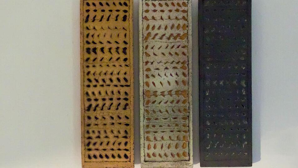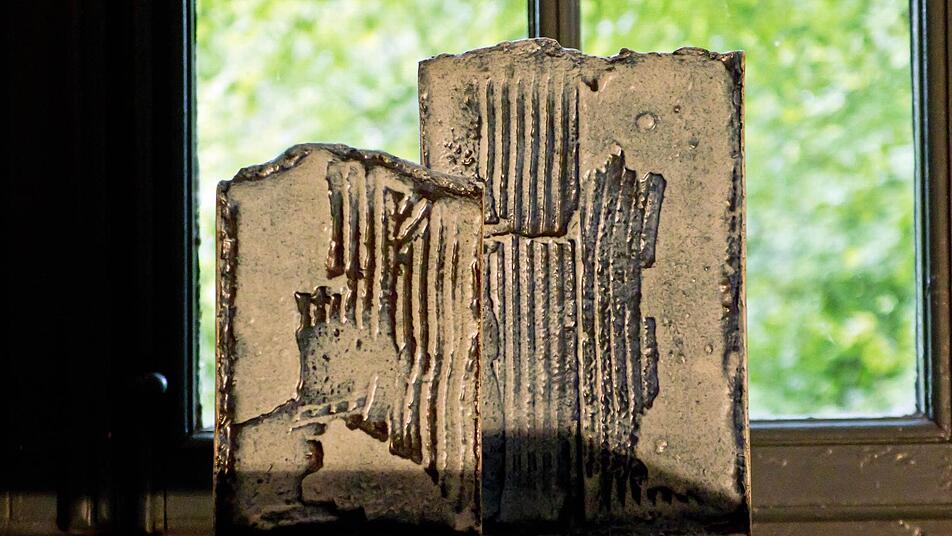 Klaus Dorrmann wiederum ist beispielsweise mit Wandobjekten vertreten, die mit geheimnisvollen Schriftzeichen versehen sind. Daneben aber finden sich auch viele Arbeiten, die das Künstler-Ehepaar arbeitsteilig gestaltet.