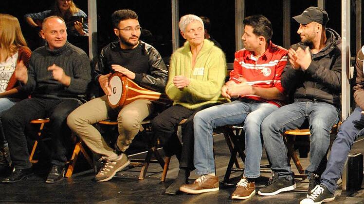 Die beachtlich vielzahlige aktive Gruppe hatte seit dem Nachmittag mit Roland Fister und weiteren Musikern des Landestheaters ausprobiert und einstudiert. Die Gemeinschaftsaktion mit dem Publikum am Abend bringt nun mitreißende rhythmische Klatschstücke hervor, sich reizvoll überlagernden Sprechgesang, dann ein "Happy Birthday" in allen verfügbaren Sprachen für Achmad, der leise gerührt lächelt in seiner spürbaren Erstarrung. Ein Besucher singt den Glückwunsch auf Paschtu.