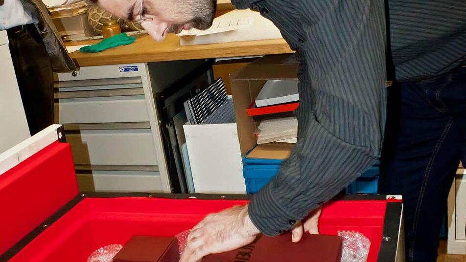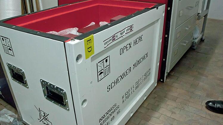 Einfache Kartons mit ein wenig schützendem Verpackungsmaterial reichen da natürlich nicht aus. Für die wertvolle Fracht taugen nur Spezialbehälter. Zwei große, gewichtige Klimakisten stehen schon seit einigen Tage in der Werkstatt von Restaurator Heiner Grieb - rechtzeitig angeliefert, damit sie sich zunächst einmal akklimatisieren können. Erschütterungen möglichst auffangen, Schwankungen von Temperatur und Luftfeuchtigkeit möglichst minimieren - das ist ihre Aufgabe. Leer wiegt die größere der beiden Kisten allein schon rund 40 Kilogramm, schätzt Kurator Sven Hauschke.
