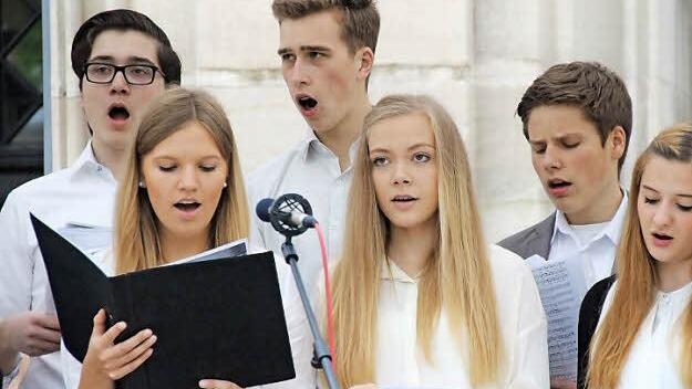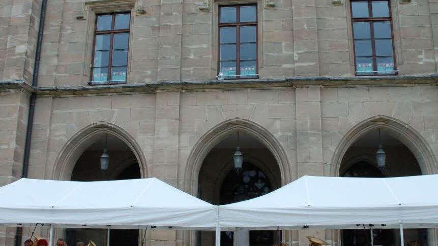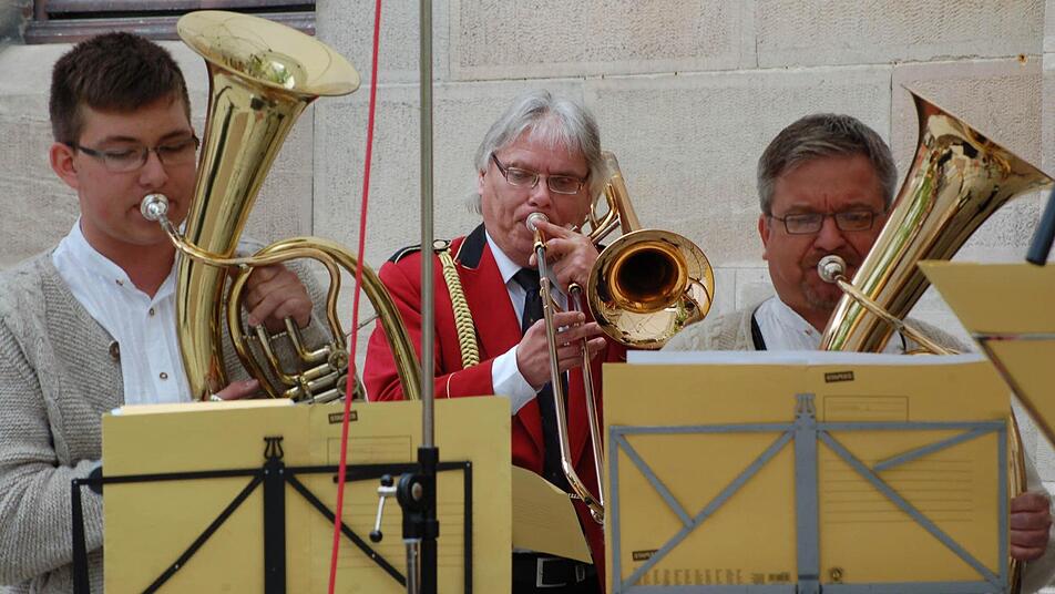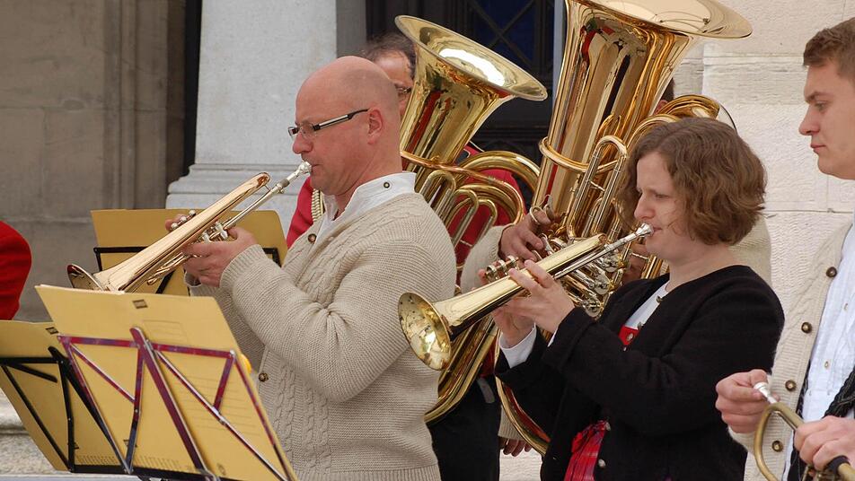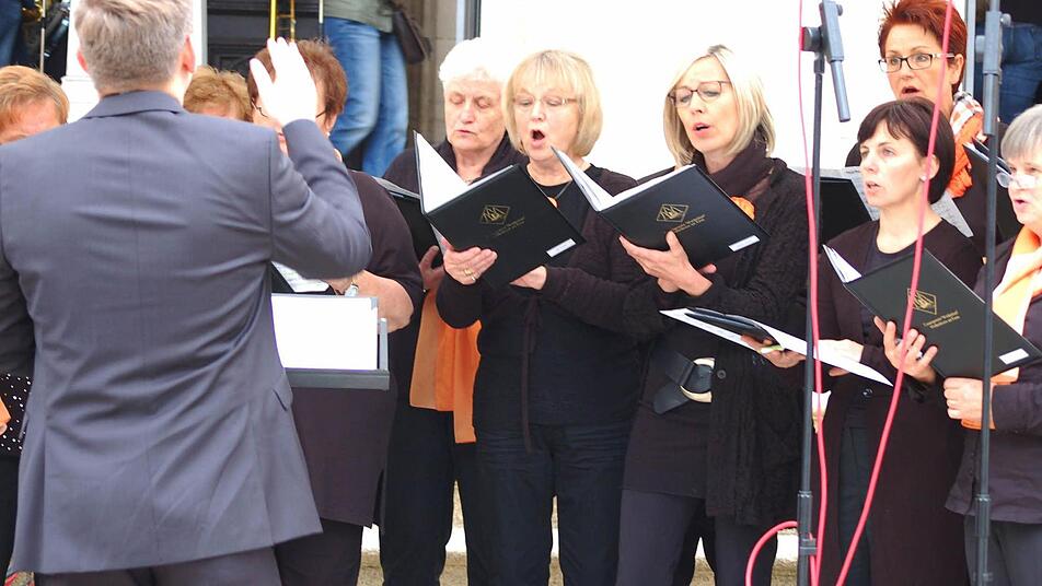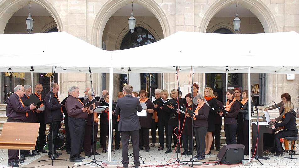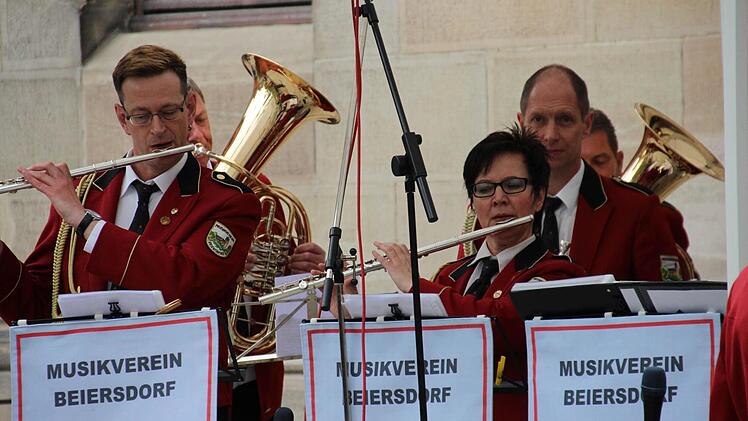 Dem Ruf des Coburger Kulturreferats folgten auch Chöre und Gruppen aus dem Landkreis. Fränkischer Sängerbund und Nordbayerischer Musikbund hatten den Aufruf verbreitet; es meldeten sich so viele Interessenten, dass Michaela Hofmann nur noch den zeitlichen Ablaufplan erstellen musste. Den Auftakt machte um 10 Uhr das Jugendblasorchester Coburg, den Schluss-Rap sang der Hochschulchor "Klangfänger", dazwischen waren der Männergesangverein Weitramsdorf, die Blaskapelle Neundorf, die "Gschrubbdn" aus Seßlach und der Musikverein Beiersdorf zu hören, um nur einige zu nennen. Alle fanden unterm Bühnenpavillon vor der Lutherschule Platz und im Notfall ein Dach überm Kopf. Übrigens: Am Ende wartete der Himmel tatsächlich mit dem Regen, bis Moderator Konstantin Hirsch das Schlusswort gesprochen hatte.