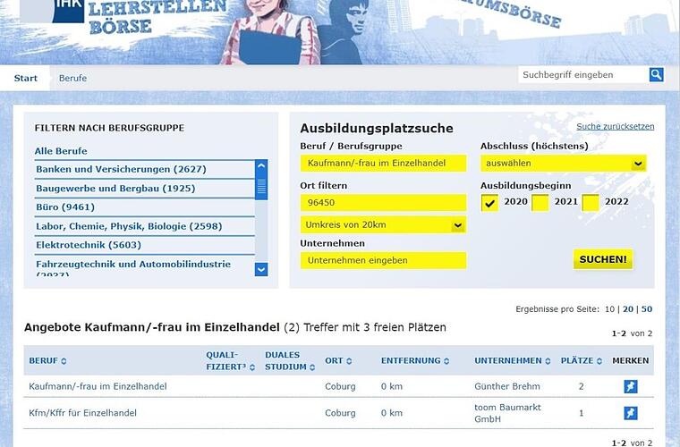 Um sowohl die lokalen und regionalen Betriebe bei der Nachwuchsgewinnung zu unterstützen als auch jungen Leuten wirksame Hilfe bei Berufsorientierung und Bewerbung zu bieten, hat die IHK zu Coburg auf ihrer Homepage (https://www.coburg.ihk.de/) eine Online-Plattform "IHK-Lehrstellen-Matching" gestartet. Hier sind viele noch unbesetzte Ausbildungsangebote in Stadt und Landkreis Coburg in 30 verschiedenen IHK-Berufen aufgelistet. Auszubildende und auch deren Eltern finden Informationen zu Ausbildungsinhalten und Anforderungen sowie die jeweiligen Stellenbeschreibungen, Adressen und Ansprechpartner der Ausbildungsbetriebe.