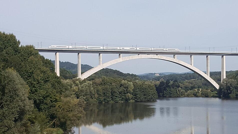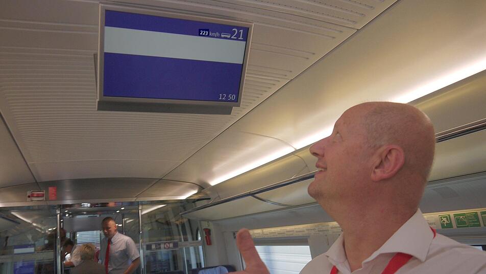 Die Testfahrt selbst verläuft zumindest auf dem Abschnitt zwischen Bamberg und Erfurt, wie am Schnürchen. Nach der Abfahrt um 10.18 Uhr in Bamberg muss der glänzend herausgeputzte ICE auf der Bestandsstrecke bis Unterleiterbach (10.31 Uhr) bei 120 bis 140 Kilometern pro Stunde dahin bummeln, erst auf den Neubauabschnitt darf Zugführer Andreas Maucher Tempo machen. Kurz vor der Itztalbrücke (die man im Coburger Land eher als "So-da-Brücke kennt) ist dann die Schallmauer von 300 "Sachen" erreicht. 10.38 Uhr ist es da, zwei Minuten später eilt der ICE hinter dem Froschgrundsee über die thüringische Landesgrenze.