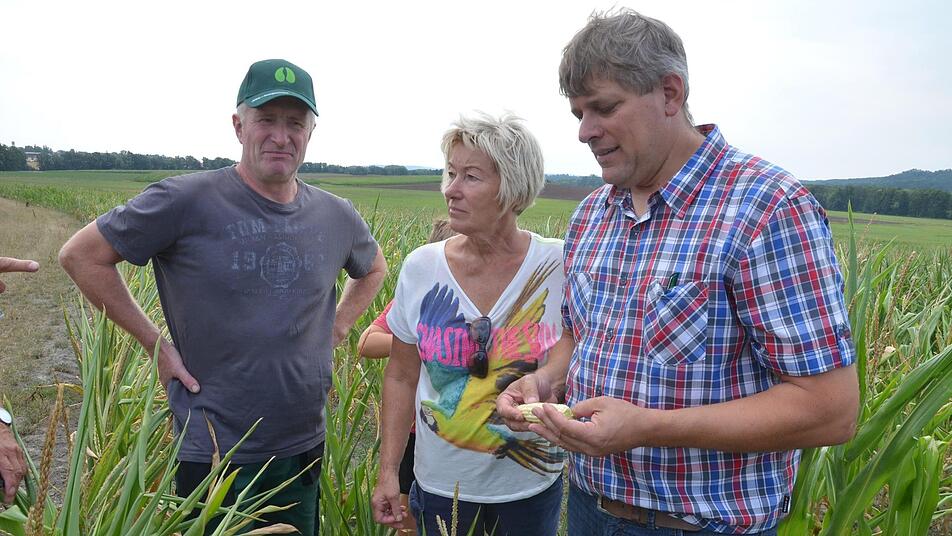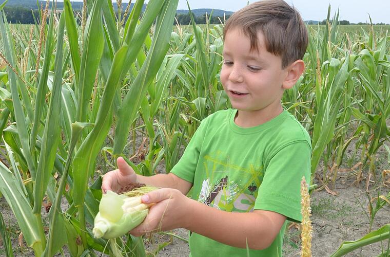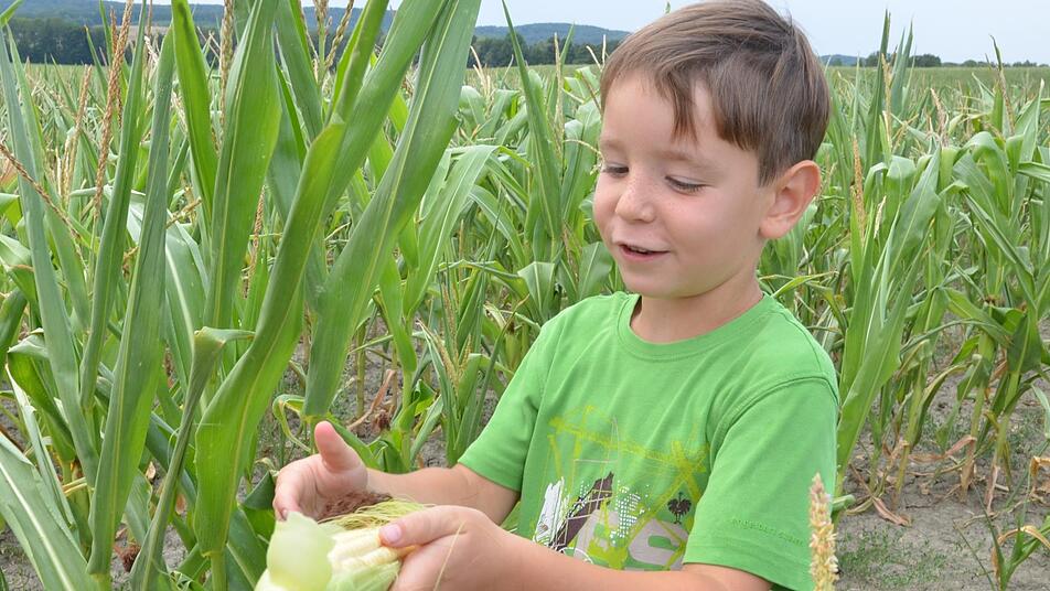 "Es müsste schon mehr als 50 Liter Regen auf den Quadratmeter geben, wenn beim Mais noch etwas gerettet werden soll", sagt Martin Flohrschütz. Auf einem Acker nahe Rossfeld schält der kleine Linus einen Kolben. Daran lässt sich erkennen, dass die Kornbildung bei etwa zwei Dritteln des Kolbens aufhört. Zusammen mit den ohnehin mickrig gebliebenen Pflanzen, wird das auf diesem Acker zu hohen Verlusten führen. Wie hoch sie ausfallen, ist von Landstrich zu Landstrich verschieden und hängt auch davon ab, wie viel Glück der Bauer bei der Aussaat hatte. Aber Verluste wird es flächendeckend geben.