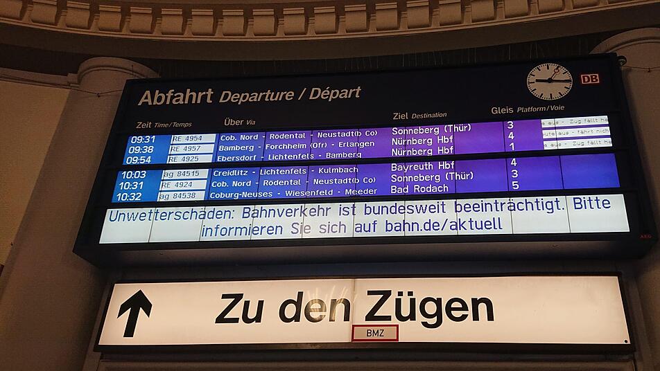"Fällt heute aus" hieß es am Montagmorgen auf der Anzeigetafel im Coburger Bahnhof, nachdem am Vorabend der Zugverkehr auf den Fernstrecken bis 10 Uhr generell abgesagt worden war. "Bitte rechnen Sie aber weiterhin mit Verspätungen und kurzfristigen Teilausfällen" hieß es noch am Nachmittag bei der Reiseauskunft der Bahn.